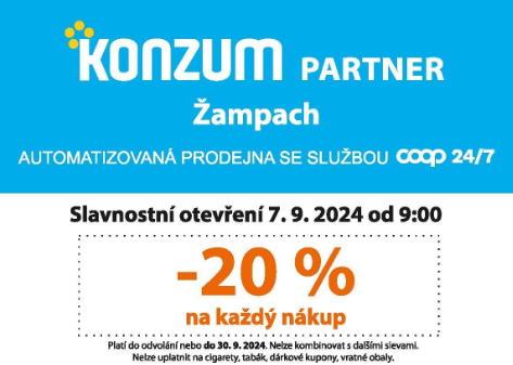 V sobotu 7. září 2024 proběhlo slavnostní otevření bezobslužné obecní prodejny KONZUM v Žampachu. Jedná se v pořadí již o 8. autonomní prodejnu obchodního družstva KONZUM Ústí nad Orlicí. KONZUM u této prodejny pokračuje v oblíbeném modelu „obecní franšízy“, kdy na projektu participuje jak obec, tak velkoobchodní partner.